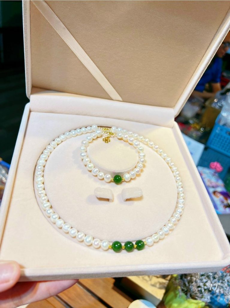 Bộ vòng ngọc trai mix ngọc bích, vàng 10K sang trọng, quý phái
